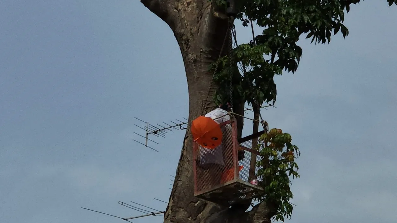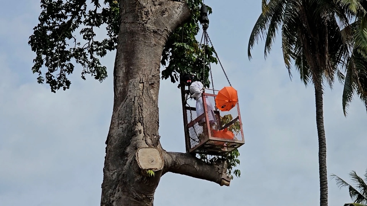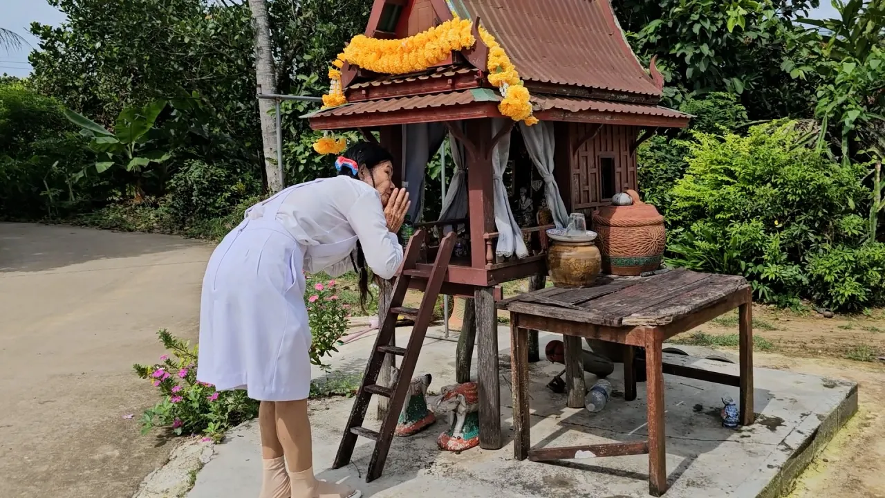 พบนางบุญชู จงปัญญาประพันธ์ ซึ่งเป็นร่างทรงของพ่อปู่แจงใหญ่ จัดของเซ่นไหว้ทำพิธีขอขมาศาลพ่อปู่ยางใหญ่ ที่ชาวบ้านเคารพนับถือ เพื่อทำการตัดต้นสำโรงที่มีขนาดใหญ่ เนื่องจากรากแก้วของต้นสำโรงไม่ได้ยึดเหนี่ยวลงดิน เกรงว่าจะโค่นลงมาทับบ้านเรือนประชาชน หลังจากร่างทรงพ่อปู่แจงใหญ่ทำพิธีขอขมาศาลพ่อปู่ยางใหญ่เสร็จแล้ว ได้ขึ้นกระเช้ารถเครน และตัดกิ่งไม้เพื่อเป็นการเบิกฤกษ์