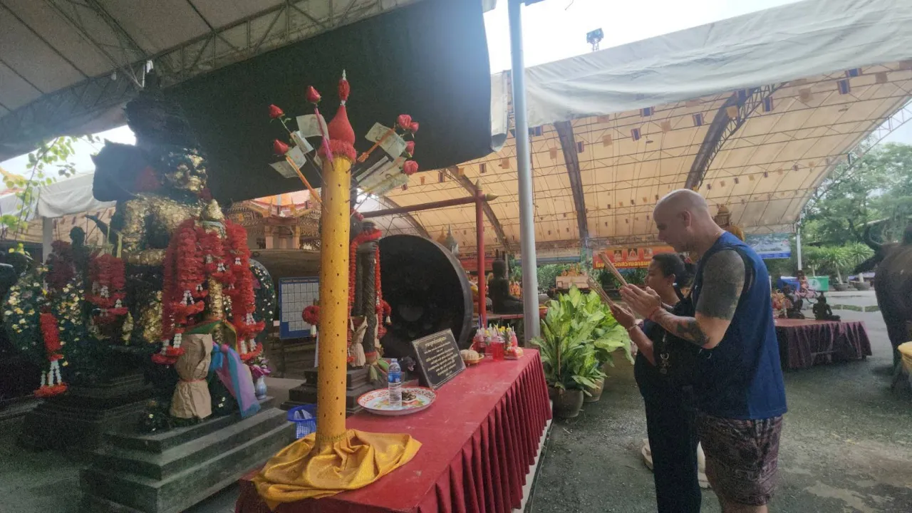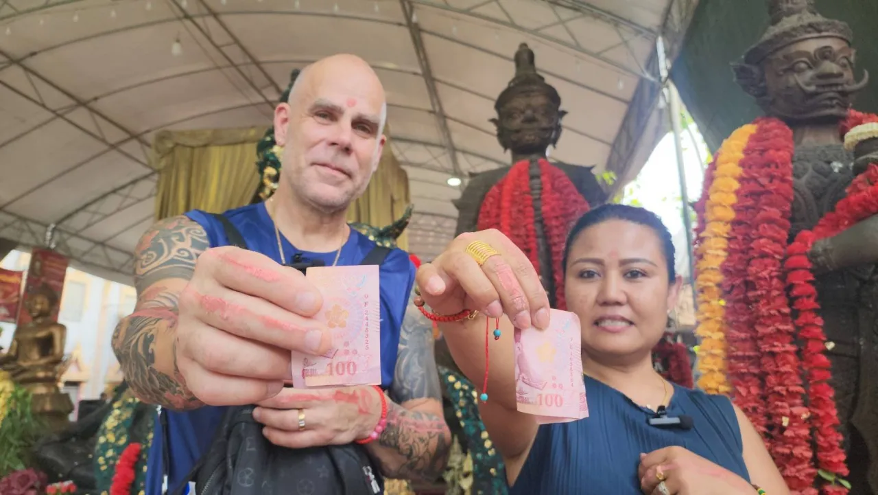 ที่วัดสว่างอารมณ์ แคแถว ต.ขุนแก้ว อ.นครชัยศรี จ.นครปฐม พบเจ้าของร้านนวดแผนไทย พร้อมด้วยสามีชาวสวีเดน มาเข้าคิวต่อแถวลงยันต์หลังมือกับหลวงพ่อแป๊ะ ขอให้ประสบผลสำเร็จในเรื่องการค้า และยังได้ขอโชคลาภจากท้าวเวสสุวรรณ อธิษฐานขอโชคลาภก้อนโตเพื่อเป็นทุน หากการค้าดีก็จะไม่กลับสวีเดน จะทำเป็นธุรกิจครอบครัว