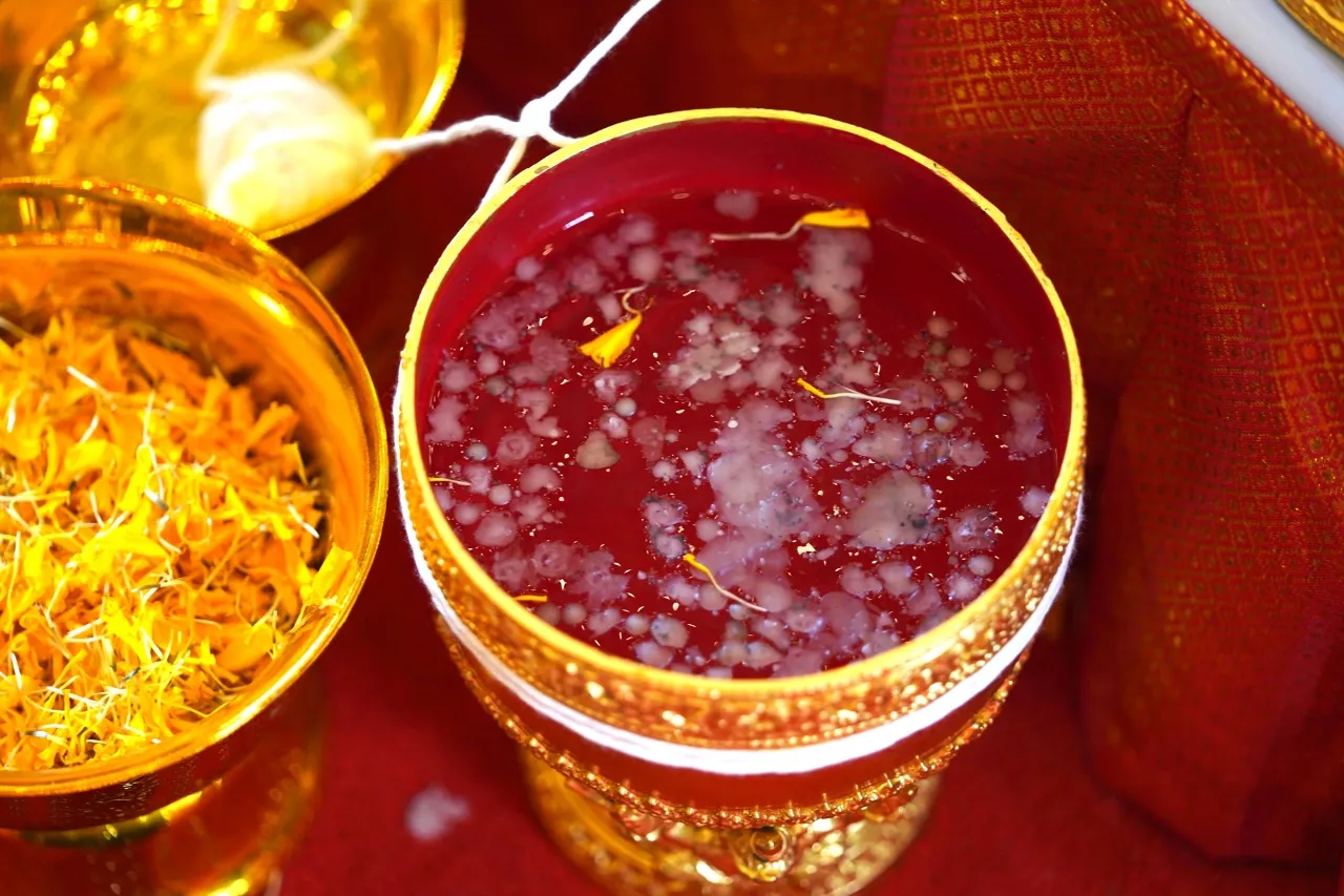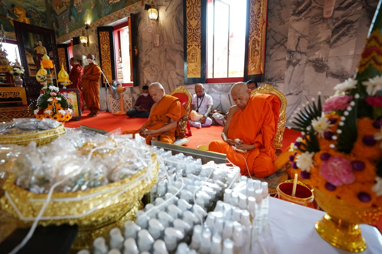 โดยพิธีปลุกเสกครั้งนี้ นอกจากหลวงพี่น้ำฝนแล้ว ยังมีพระเกจิดังจากภาคกลาง 10 รูป เข้าร่วมในพิธีนั่งปรกอธิษฐานจิต พร้อมจัดของมงคลทั้ง 8 ประการ ประกอบไปด้วย 1. กรอบหน้า 2. ตะบอง (คทา) 3. สังข์ 4. จักร 5. ธงชัย (ธงชาย) 6. ขอช้าง 7. โคอุสภะ 8. หม้อน้ำมนต์ ตามตำรับโบราณ เพื่อความเป็นสิริมงคล โดยใช้วันมหามงคล 12 สิงหาคม วันพระราชสมภพ เฉลิมพระชนมพรรษา สมเด็จพระนางเจ้าพระบรมราชินีนาถ (พระพันปีหลวง) เป็นวันมงคลในการปลุกเสกครั้งนี้ ใช้เวลาร่วม 3 ชม. จึงเสร็จสิ้น