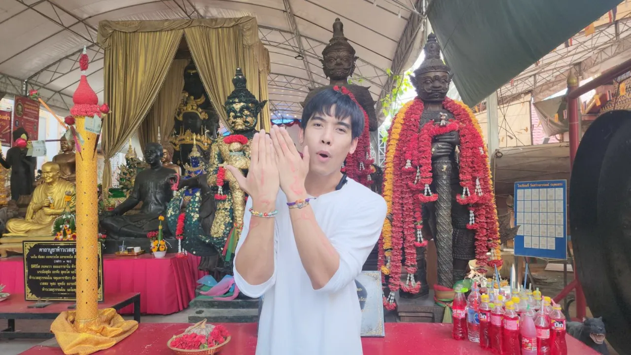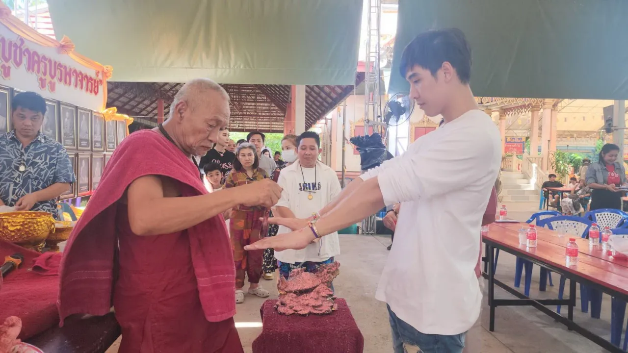 เมื่อเสร็จสิ้น ได้มอบผ้ายันต์พระพุทธเจ้า 16 พระองค์ และตะกรุดหลวงปู่มหาศิลา ที่กำลังโด่งดังให้พกติดตัวไว้ เพื่อคุ้มครองป้องกันภัยพิบัติ และให้เกิดความเจริญรุ่งเรืองในการแสดง จากนั้น ปาร์ค ภัทรพงศ์ ได้เข้ากราบไหว้ขอพรองค์ท้าวเวสสุวรรณ ที่มีขนาดความสูงกว่า 4 เมตร นำพวงมาลัยสีแดง และฟักทองใส่พานถวาย จุดธูปบูชา ซึ่งภายในถาดนั้นมีธูปมงคลที่เตรียมมาด้วย ตั้งจิตอธิษฐานขอพรและขอโชคลาภ แล้วนำหน้าผากจรดแตะที่กระบองยันกายขององค์ท้าวเวสสุวรรณ ก่อนจะคล้องพวงมาลัยเพื่อความเป็นสิริมงคล